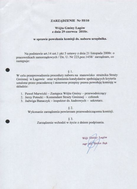 | Zarządzenie Nr 55/10 Wójta Gminy Łagów z dnia 29 czerwca 2010 r. w sprawie powołania komisji ds. naboru urzędnika | 2010-09-07 |