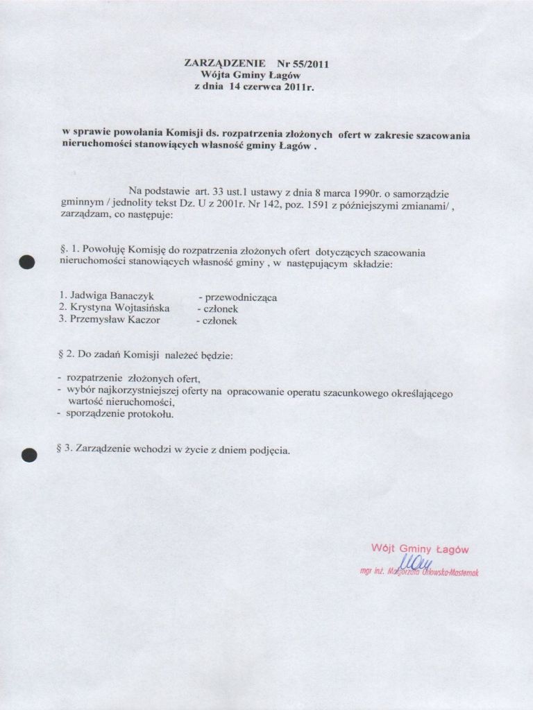 | Zarządzenie Nr 55/2011 Wójta Gminy Łagów z dnia 14 czerwca 2011 r. w sprawie powołania Komisji ds. rozpatrywania złożonych ofert w zakresie szacowania nieruchomości stanowiących własność gminy Łagów | 2012-10-03 |