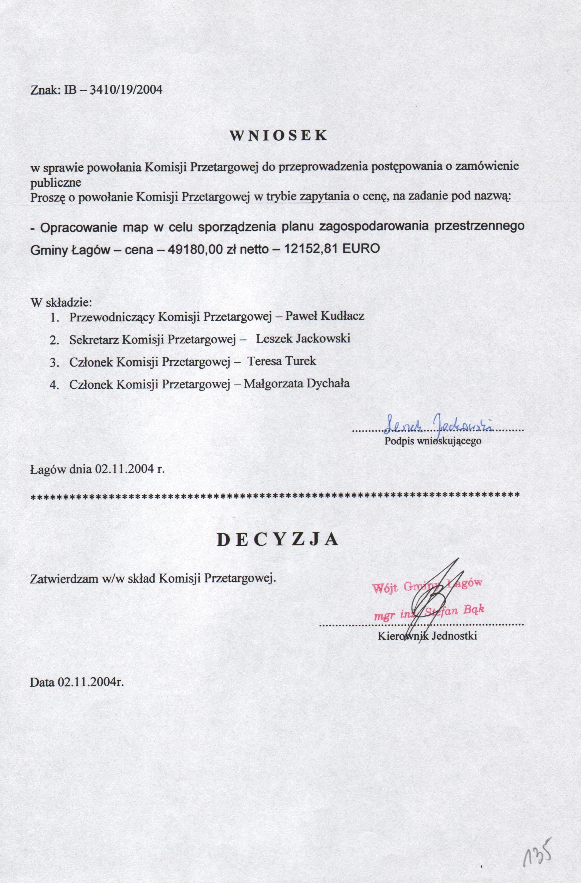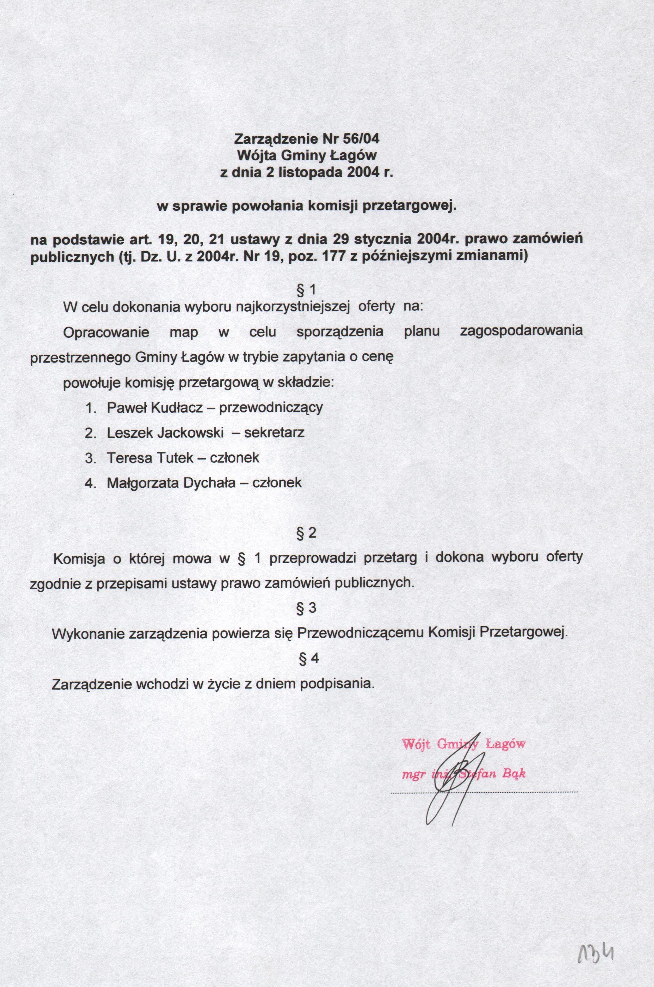 | Zarządzenie nr 56/04 Wójta Gminy Łagów z dn.2 listopada 2004 r. w sprawie powołania komisji przetargowej. | 2008-10-22 |