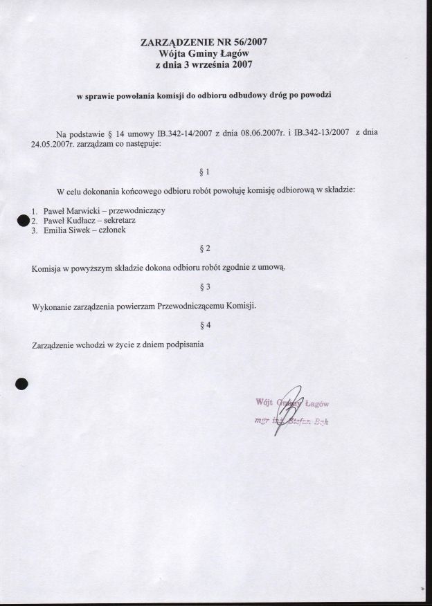 | Zarządzenie nr 56/07 Wójta Gminy Łagów z dn. 3 września 2007 r. w sprawie powołania komisji do odbioru odbudoy dróg po powodzi. | 2008-08-26 |