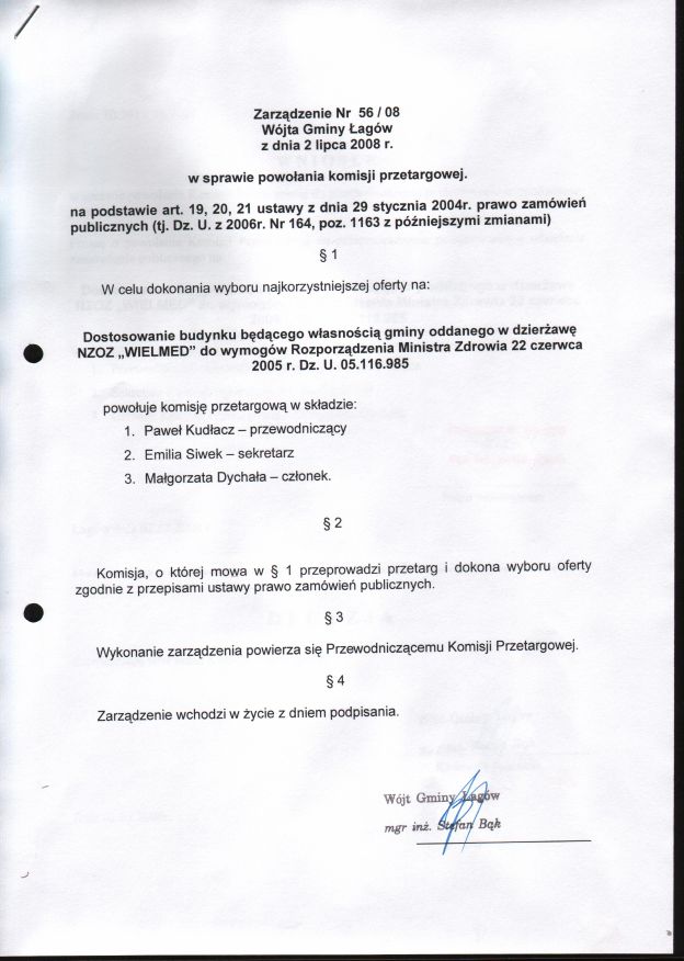 | Zarządzenie nr 56/08 Wójta Gminy Łagów z dn. 2 lipca 2008 r. w sprawie powołania komisji przetargowej. | 2008-08-25 |