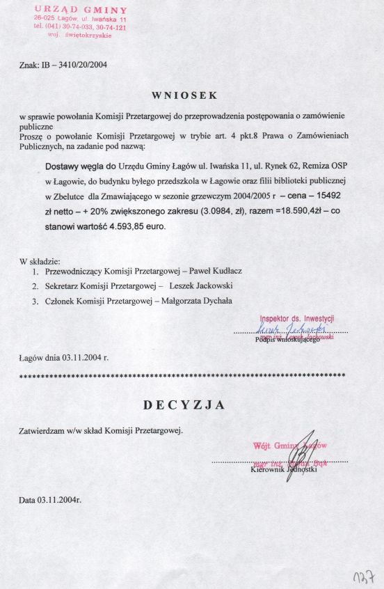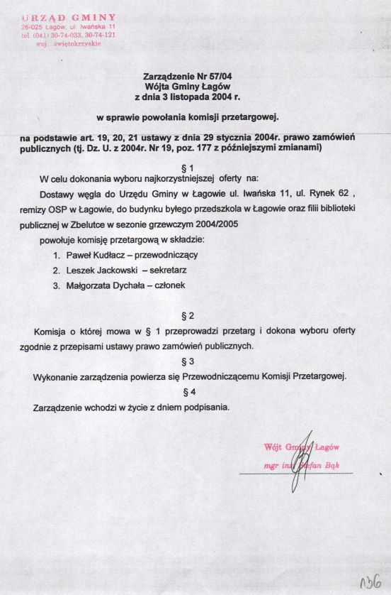 | Zarządzenie nr 57/04 Wójta Gminy Łagów z dn. 3 listopada 2004 r. w sprawie powołania komisji przetargowej. | 2008-10-22 |