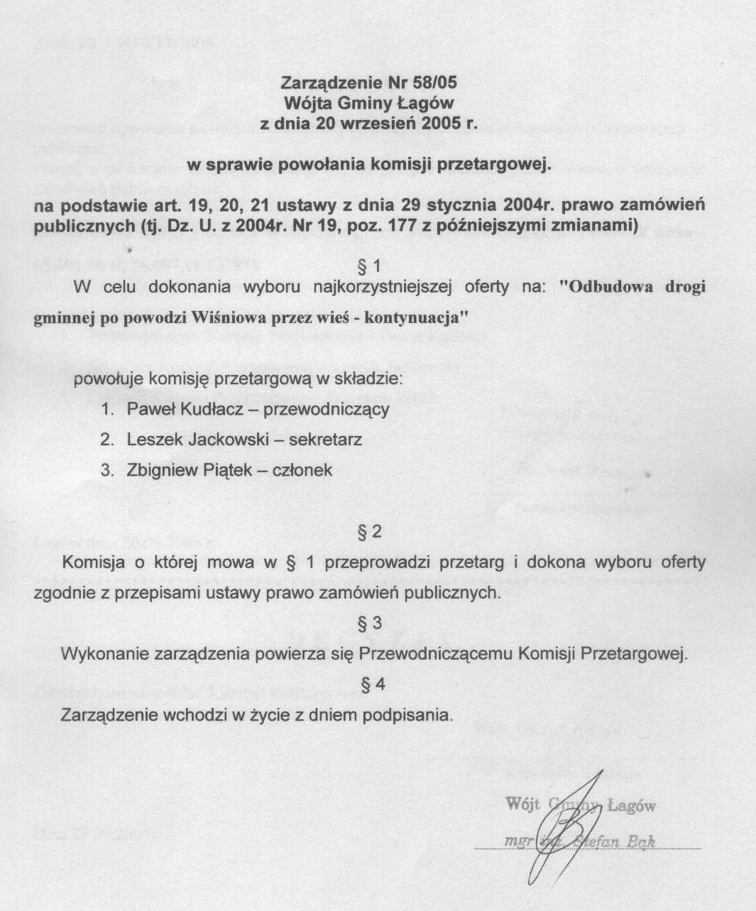 | Zarządzenie nr 58/05 Wójta Gminy Łagów z dn. 20 września 2005 r. w sprawie powołania komisji przetargowej. | 2008-10-17 |