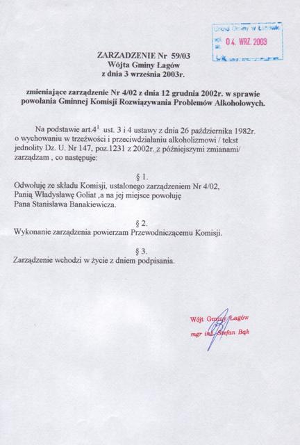| Zarządzenie nr 59/03 Wójta Gminy Łagów z dn. 3 września 2003 r. zmieniające zarządzenie nr 4/02 z dn. 12 grudnia 2002 r. w sprawie powołania Gminnej Komisji Rozwiązywania Problemów Alkoholowych. | 2008-10-23 |