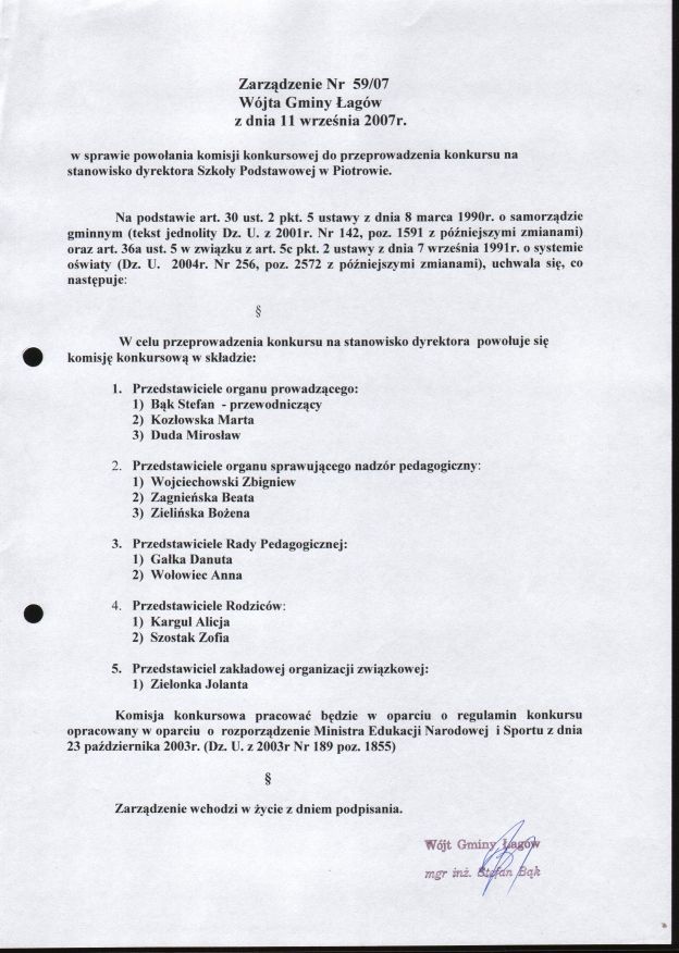 | Zarządzenie nr 59/07 Wójta Gminy Łagów z dn. 11 września 2007 r. w sprawie powołania komisji konkursowej do przeprowadzenia konkursu na stanowisko dyrektora Szkoły Podstawowej w Piotrowie. | 2008-08-26 |