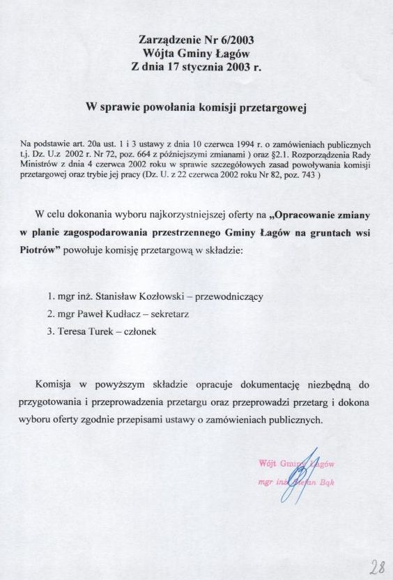 | Zarządzenie nr 6/03 Wójta Gminy Łagów z dn. 17 stycznia 2003 r. w sprawie powołania komisji przetargowej. | 2008-10-23 |