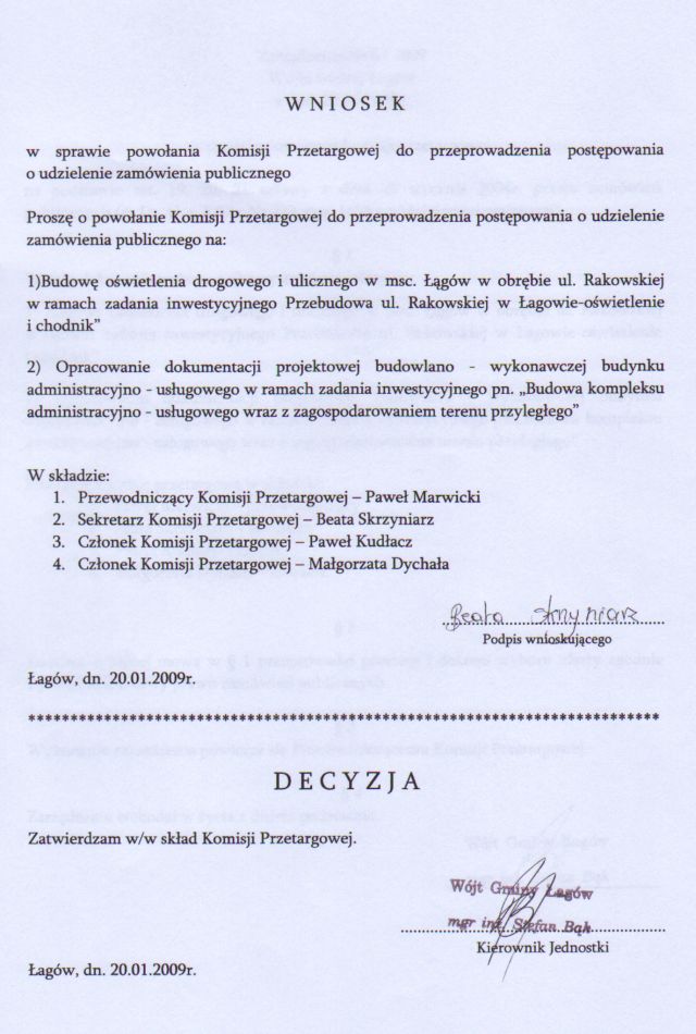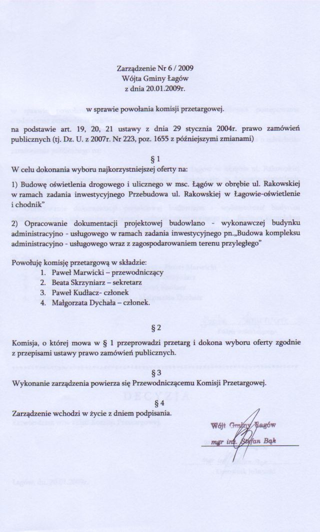 | Zarządzenie Nr 6/09 Wójta Gminy Łagów z dn. 20 stycznia 2009 r. w sprawie powołania komisji przetargowej. | 2009-02-09 |