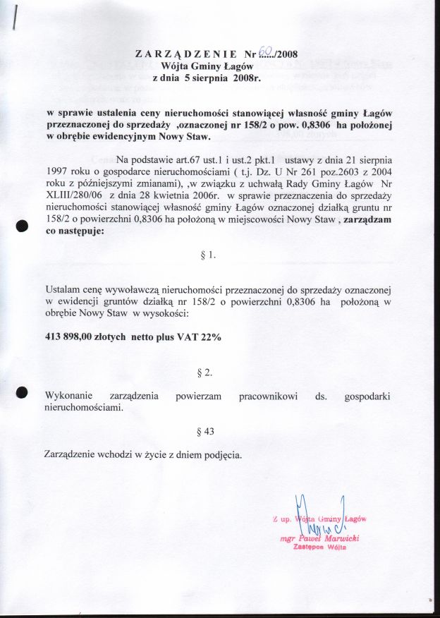| Zarządzenie nr 60/08 Wójta Gminy Łagów z dn. 5 sierpnia 2008 r. w sprawie ustalenia ceny nieruchomości ... | 2008-08-25 |