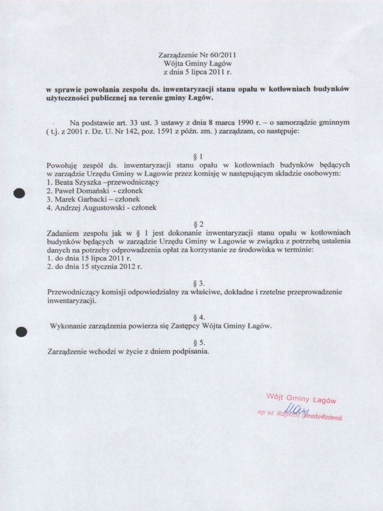 | Zarządzenie Nr 60/2011 Wójta Gminy Łagów z dnia 05 lipca 2011 r. w sprawie powołania zespołu ds. inwentaryzacji stanu opału w kotłowniach budynków użyteczności publicznej na terenie Gminy Łagów | 2012-10-03 |