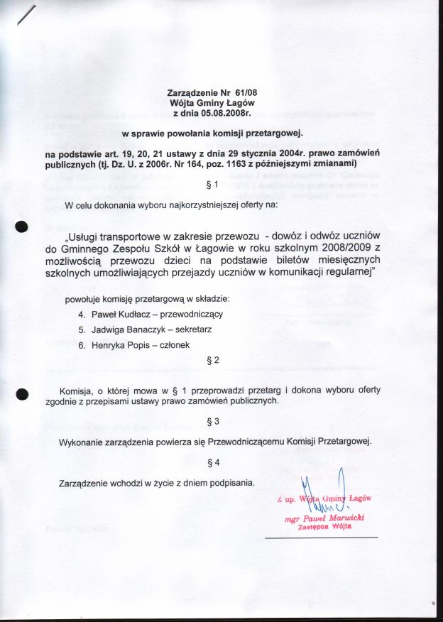 | Zarządzenie nr 61/08 Wójta Gminy Łagów z dn. 5 sieprnia 2008 r. w sprawie powołania komisji przetargowej. | 2008-08-25 |