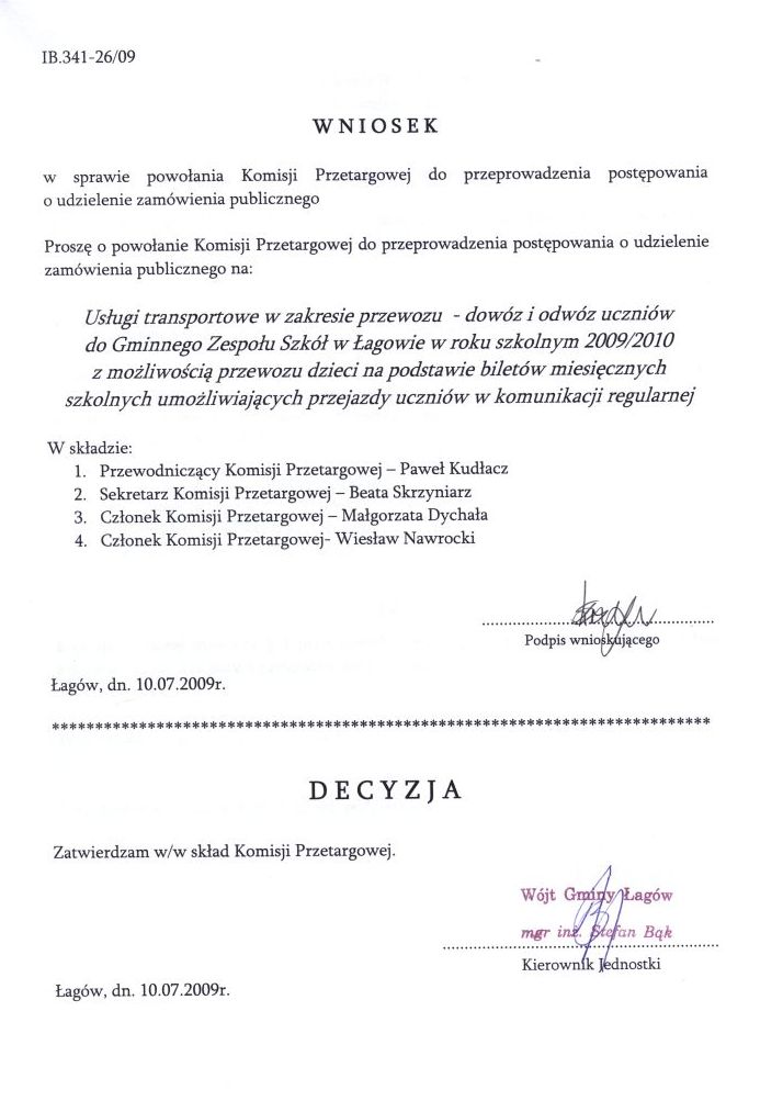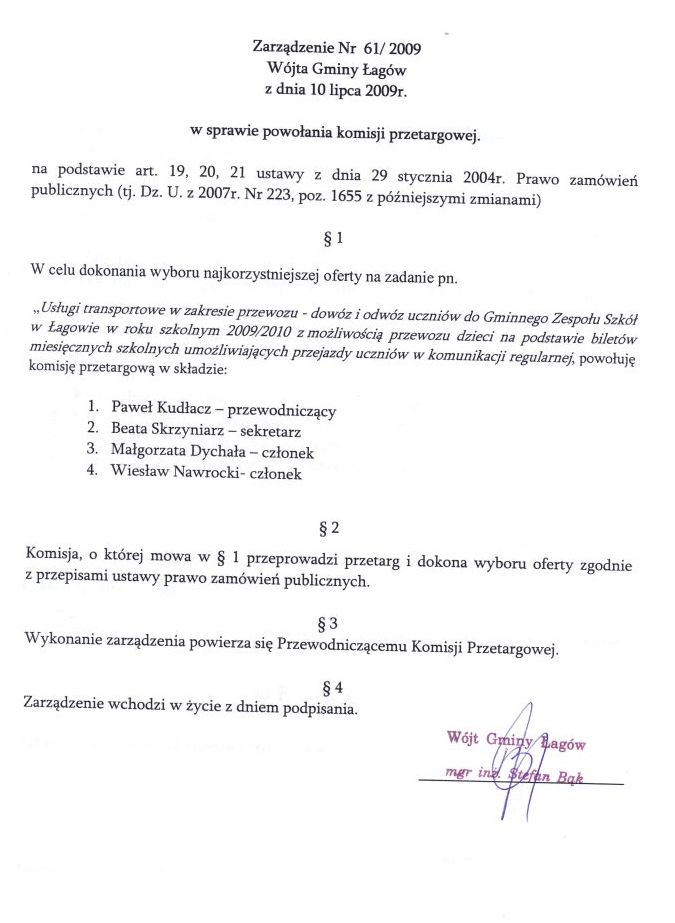 | Zarządzenie nr 61/09 Wójta Gminy Łagów z dnia 10 lipca 2009r. w sprawie powołania komisji przetargowej. | 2009-07-29 |