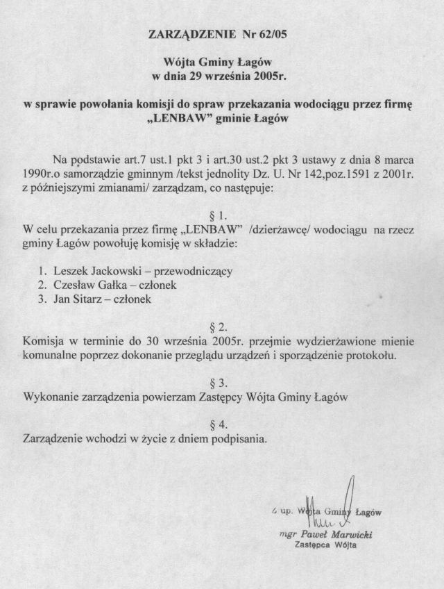 | Zarządzenie nr 62/05 Wójta Gminy Łagów z dn. 29 września 2005 r. w sprawie powołania komisji do spraw przekazania wodociągu. | 2008-10-17 |