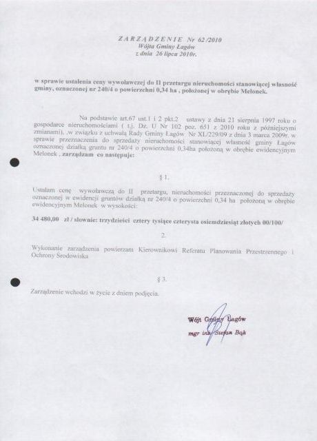 | Zarządzenie Nr 62/10 Wójta Gminy Łagów z dnia 26 lipca 2010 r. w sprawie ustalenia ceny wywoławczej do II przetargu nieruchomości stanowiącej własność gminy, oznaczonej nr 240/04 o pow. 0,34 ha położonej w obrębie Melonek | 2010-09-08 |