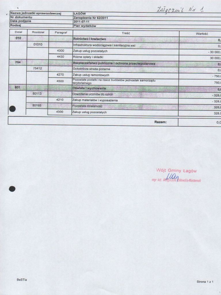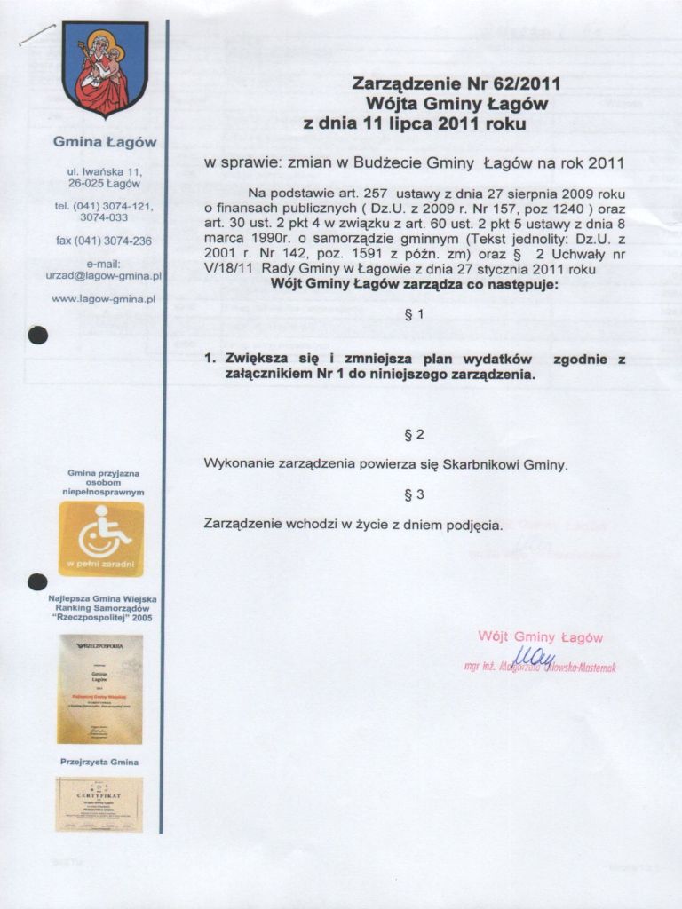 | Zarządzenie Nr 62/2011 Wójta Gminy Łagów z dnia 11 lipca 2011 roku w sprawie: zmian w Budżecie Gminy Łagów na rok 2011 | 2012-10-03 |