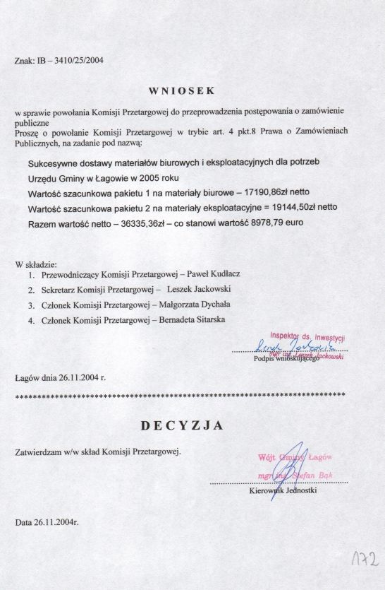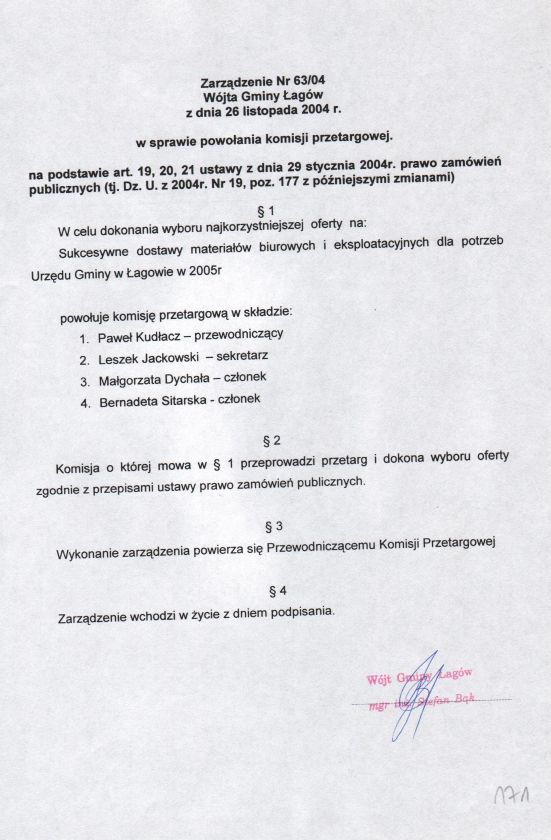 | Zarządzenie nr 63/04 Wójta Gminy Łagów z dn. 26 listopada 2004 r. w sprawie powołania komisji przetargowej. | 2008-10-22 |