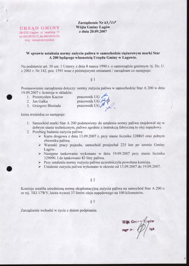 | Zarządzenie nr 63/07 Wójta Gminy Łagów z dn. 20.09.2007 r. w sprawie ustalenia normy zużycia paliwa w samochodzie ciężarowym marki Star A 200 będącego własnością Urzędu Gminy w Łagowie. | 2008-08-27 |