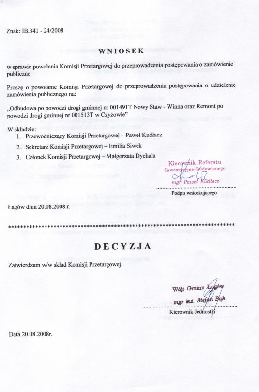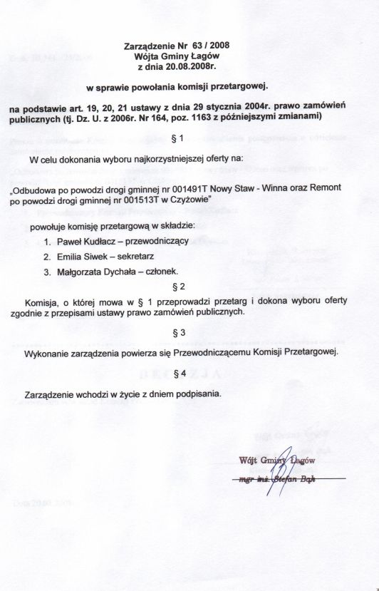 | Zarządzenie nr 63/08 Wójta Gminy Łagów z dn. 20 sierpnia 2008 r. w sprawie powołania komisji przetargowej | 2008-10-02 |