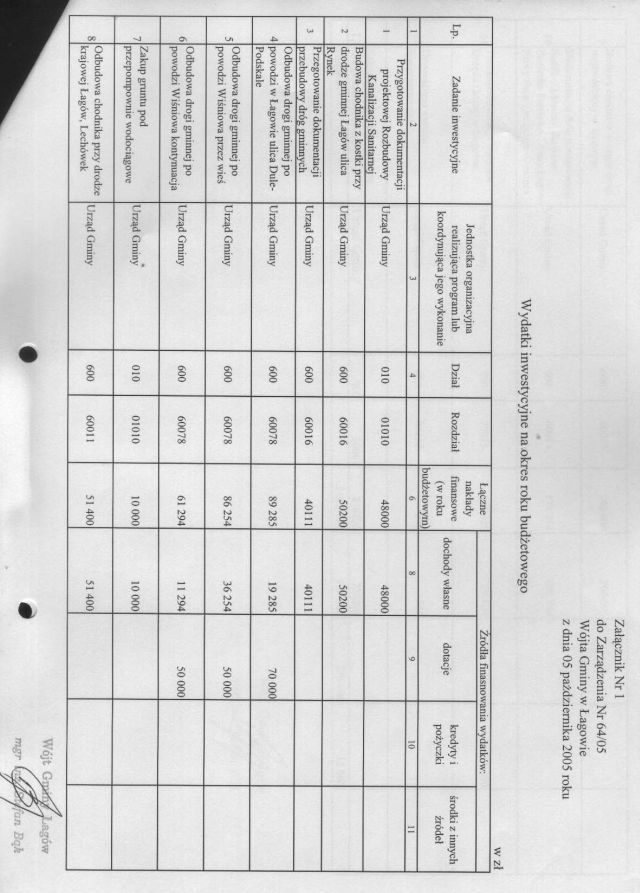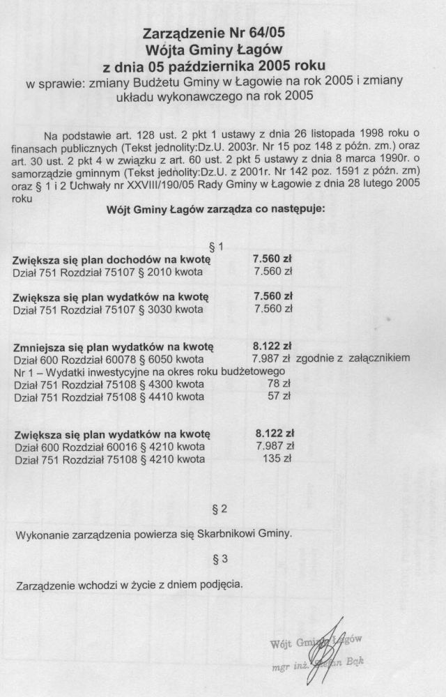 | Zarządzenie nr 64/05 Wójta Gminy Łagów z dn. 5 października 2005 r. w sprawie zmiany Budżetu Gminy w Łagowie na rok 2005 i zmiany układu wykonawczwego na rok 2005. | 2008-10-17 |