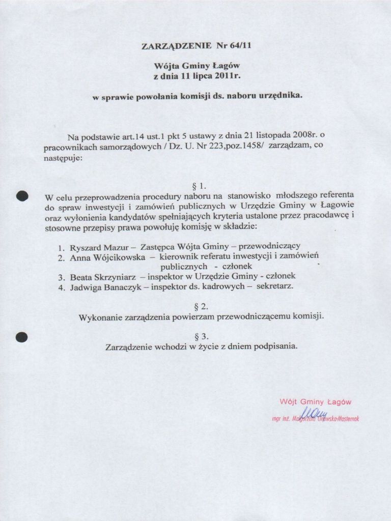 | Zarządzenie nr 64/11 Wójta Gminy Łagów z dnia 11 lipca 2011 r. w sprawie powołania komisji ds. naboru urzędnika | 2012-10-03 |