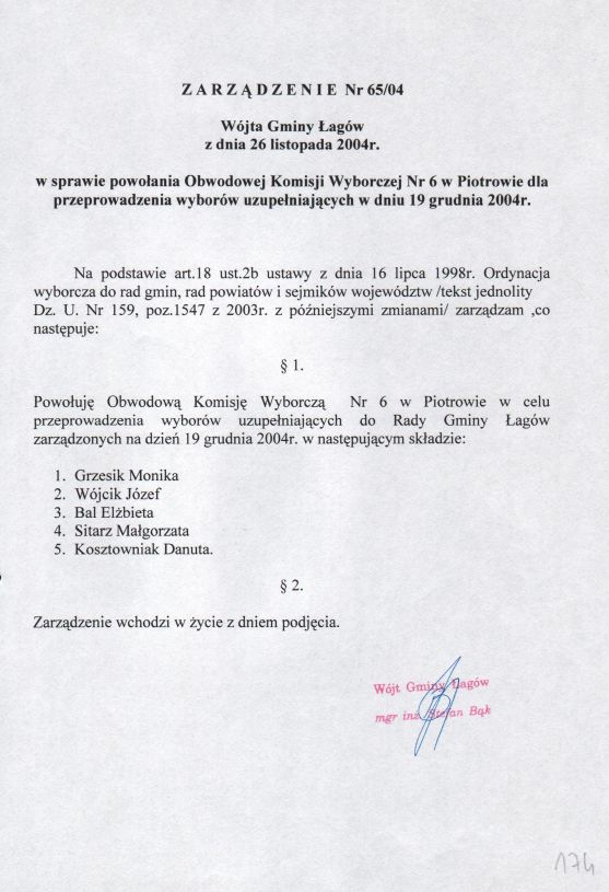 | Zarządzenie nr 65/04 Wójta Gminy Łagów z dn. 26 listopada 2004 r. w sprawie powołania Obwodowej Komisji Wyborczej Nr 6 w Piotrowie dla przeprowadzenia wyborów uzupełniających w dniu 19 grudnia 2004r. | 2008-10-22 |