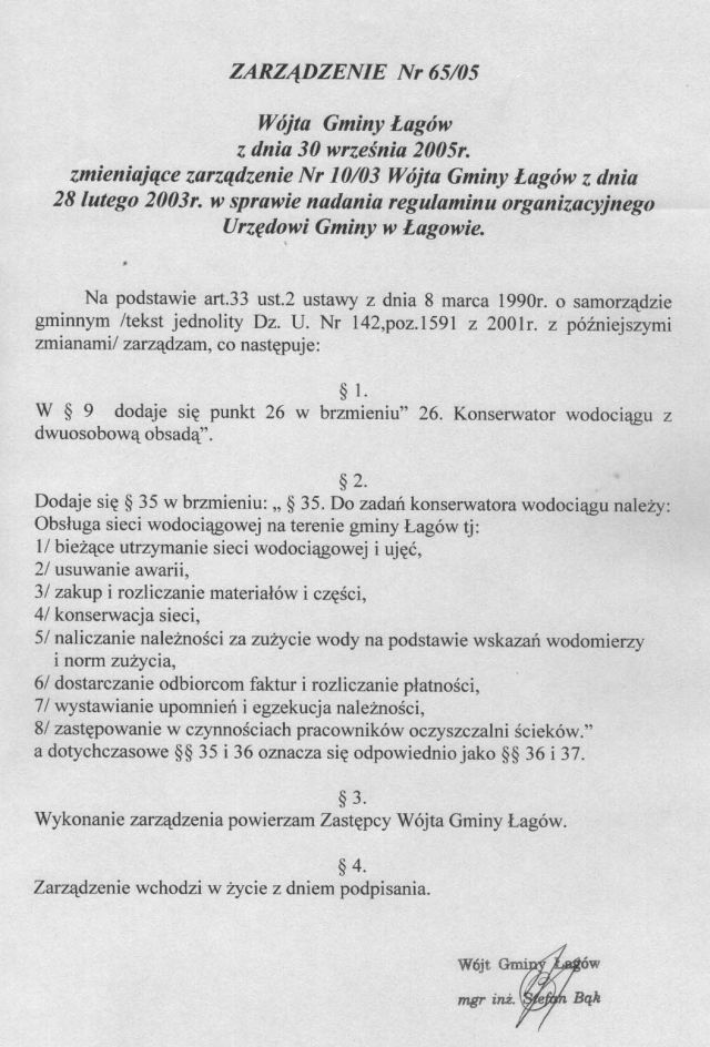 | Zarządzenie nr 65/05 Wójta Gminy Łagów z dn. 30 września 2005 r. zmieniające Zarządzenie nr 10/03. | 2008-10-17 |
