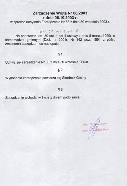 | Zarządzenie nr 66/03 Wójta Gminy Łagów z dn. 6 października 2003 r. w sprawie uchylenia Zarządzenia nr 63 z dnia 30 września 2003 r. | 2008-10-23 |