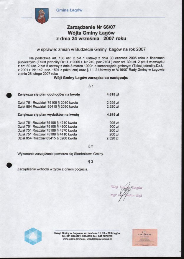 | Zarządzenie nr 66/07 Wójta Gminy Łagów z dn. 24 września 2007 r. w sprawie zmian w Budżecie Gminy Łagów na rok 2007. | 2008-08-27 |