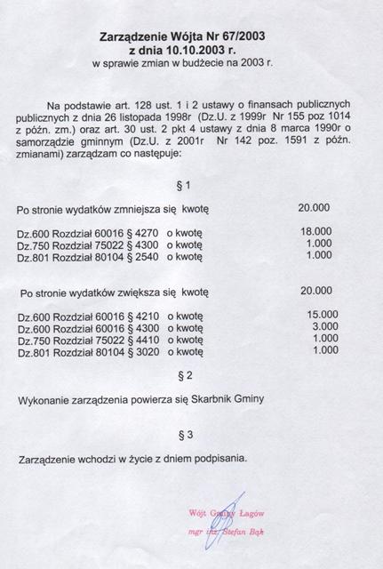 | Zarządzenie nr 67/03 Wójta Gminy Łagów z dn. 10 października 2003 r. w sprawie zmian w budżecie na 2003 r. | 2008-10-23 |