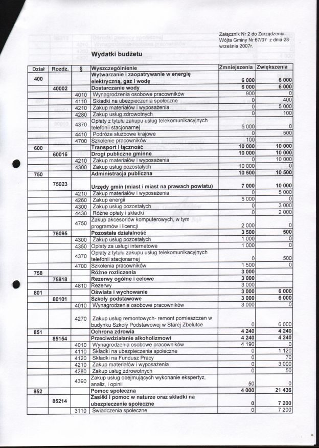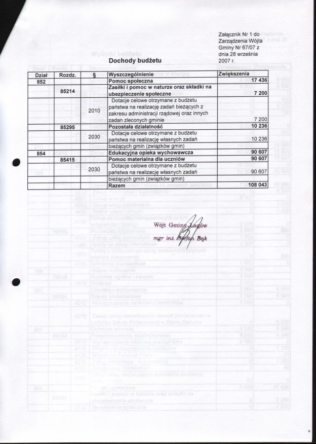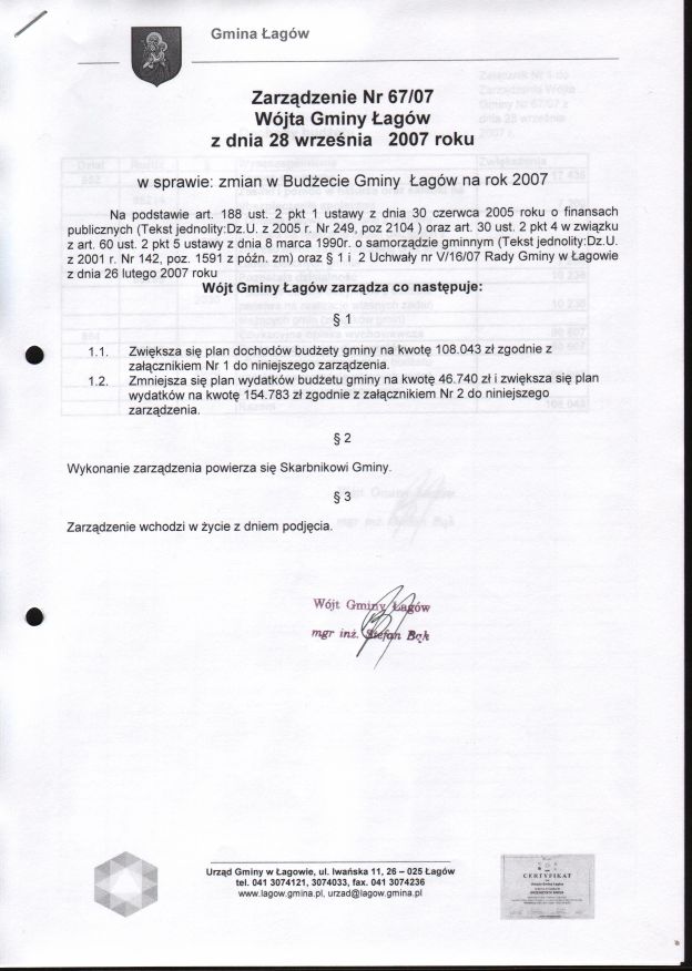 | Zarządzenie nr 67/07 Wójta Gminy Łagów z dn. 28 września 2007 r. w sprawie zmian w Budżecie Gminy Łagów na rok 2007. | 2008-08-27 |
