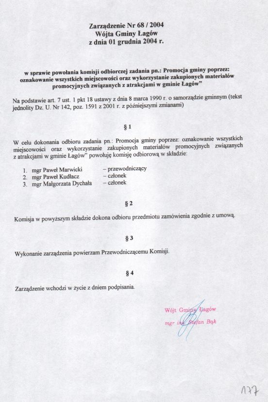| Zarządzenie nr 68/04 Wójta Gminy Łagów z dn. 1 grudnia 2004 r. w sprawie powołania komisji odbiorczej. | 2008-10-22 |