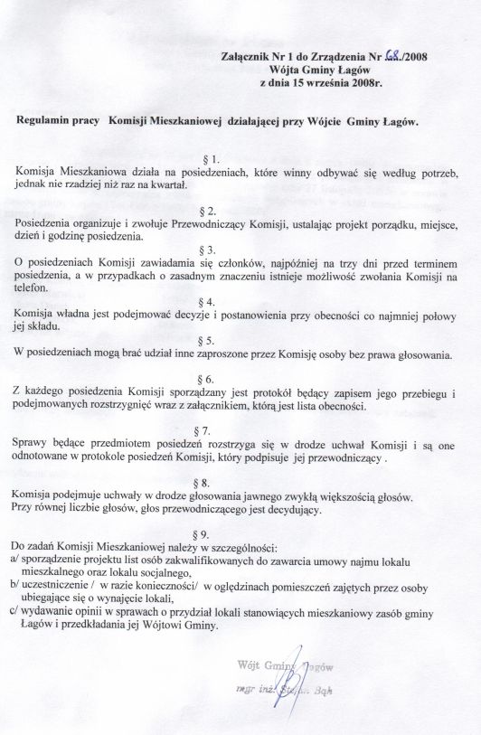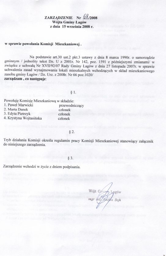 | Zarządzenie nr 68/08 Wójta Gminy Łagów z dn. 15 września 2008 r. w sprawie powołania komisji mieszkaniowej | 2008-10-02 |