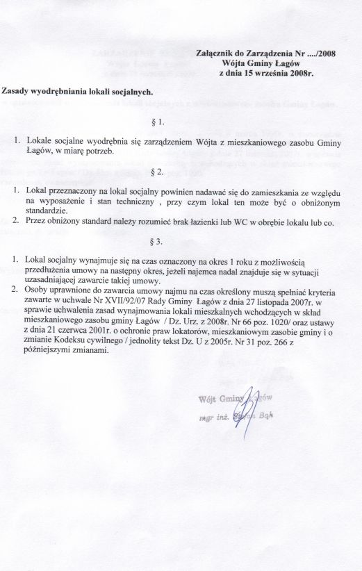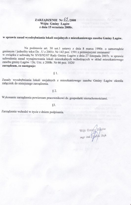 | Zarządzenie nr 69/08 Wójta Gminy Łagów z dn. 15 września 2008 r. w sprawie zasad wyodrębniania lokali socjalnych z mieszkaniowego zasobu Gminy Łagów | 2008-10-02 |