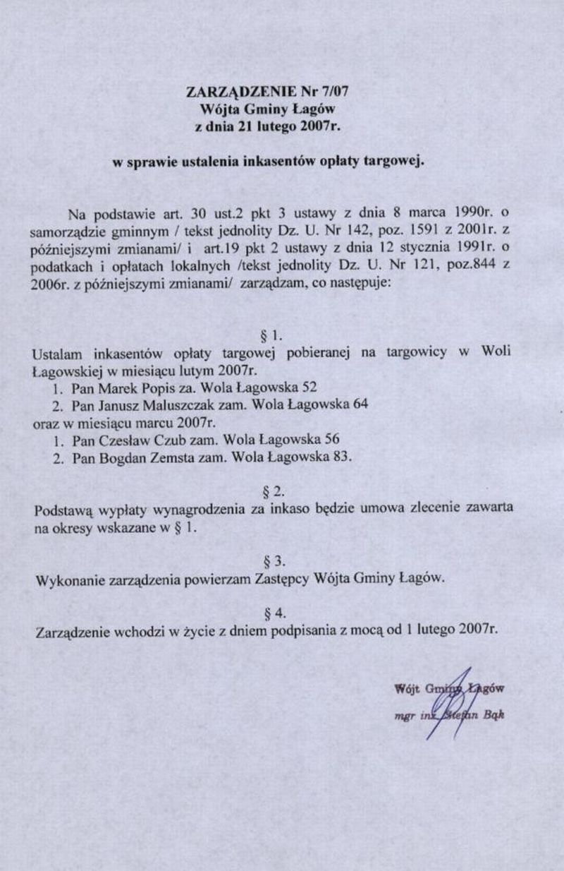 | Zarządzenie nr 7/07 Wójta Gminy Łagów z dn. 21 lutego 2007 r. w sprawie ustalenia inkasentów opłaty targowej. | 2008-08-25 |