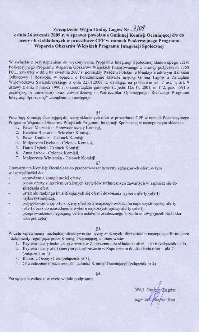 | Zarządzenie Nr 7/09 Wójta Gminy Łagów z dn. 26 stycznia 2009 r. w sprawie powołania Gminnej Komisji Oceniającej d/s do oceny ofert składanych w procedurze CPP w ramach Poakcesyjnego Programu Wsparcia Obszarów Wiejskich... | 2009-02-09 |