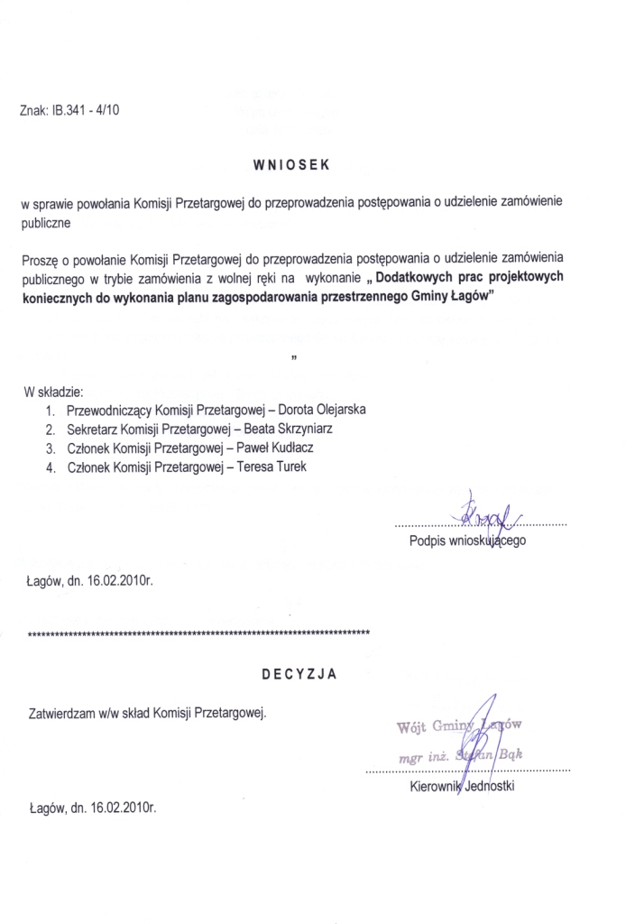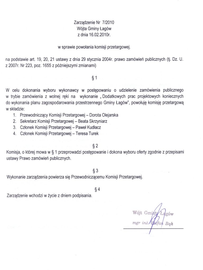| Zarządzenie nr 7/10 Wójta Gminy Łagów z dnia 16 lutego 2010 r. w sprawie powołania komisji przetargowej | 2010-03-04 |
