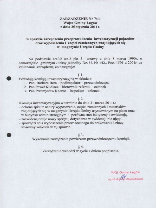 | Zarządzenie Nr 7/11 Wójta Gminy Łagów z dnia 25 tycznia 2011 r. w sprawie zarządzenia przeprowadzenia inwentaryzacji pojazdów oraz wyposażenia i części zamiennych znajdujących się w magazynie Urzędu Gminy | 2011-02-03 |