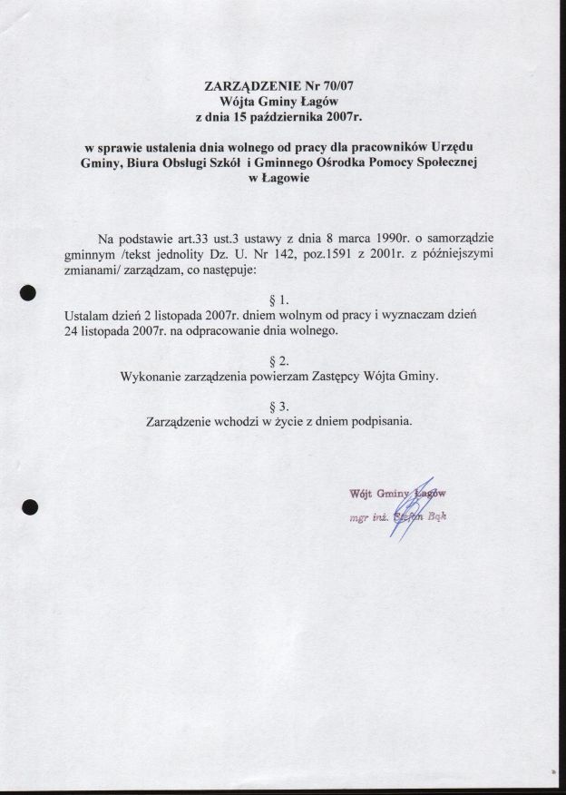 | Zarządzenie nr 70/07 Wójta Gminy Łagów z dn. 15 października 2007 r. w sprawie ustalenia dnia wolnego od pracy dla pracowników ... | 2008-08-27 |
