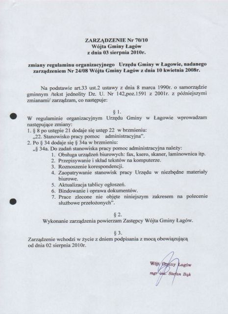 | Zarządzenie Nr 70/10 Wójta Gminy Łagów z dnia 03 sierpnia 2010 r. w sprawie zmiany regulaminu organizacyjnego Urzędu Gminy w Łagowie, nadanego Zarządzeniem Nr 24/08 Wójta Gminy Łagów z dnia 10 kwietnia 2008 r. | 2010-09-13 |