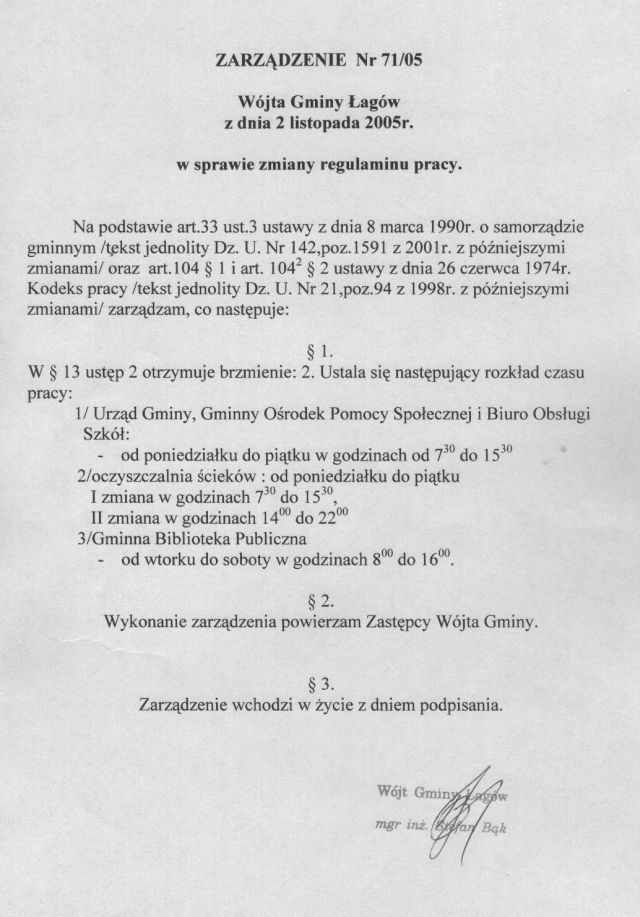 | Zarządzenie nr 71/05 Wójta Gminy Łagów z dn. 2 listopada 2005 r. w sprawie zmiany regulaminu pracy. | 2008-10-17 |
