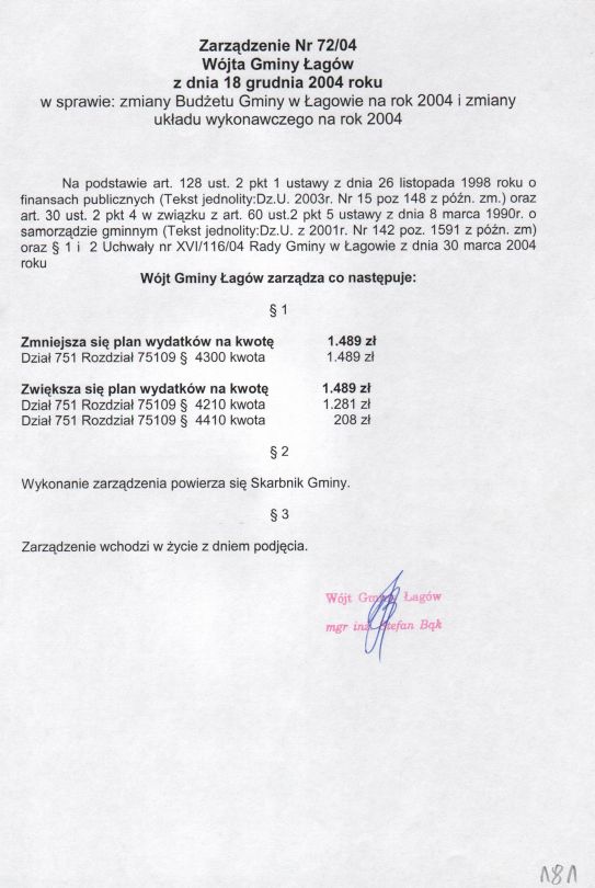 | Zarządzenie nr 72/04 Wójta Gminy Łagów z dn. 18 grudnia 2004 r. w sprawie: zmiany Budżetu Gminy w Łagowie na rok 2004 i zmiany układu wykonawczego na rok 2004. | 2008-10-22 |