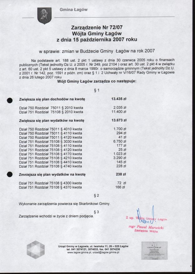 | Zarządzenie nr 72/07 Wójta Gminy Łagów z dn. 15 października 2007 r. w sprawie zmian w Budżecie Gminy Łagów na rok 2007. | 2008-08-27 |