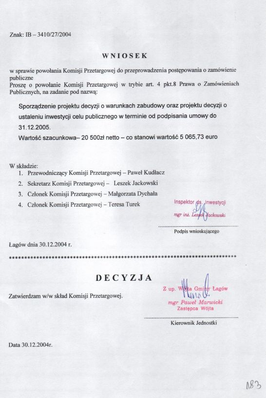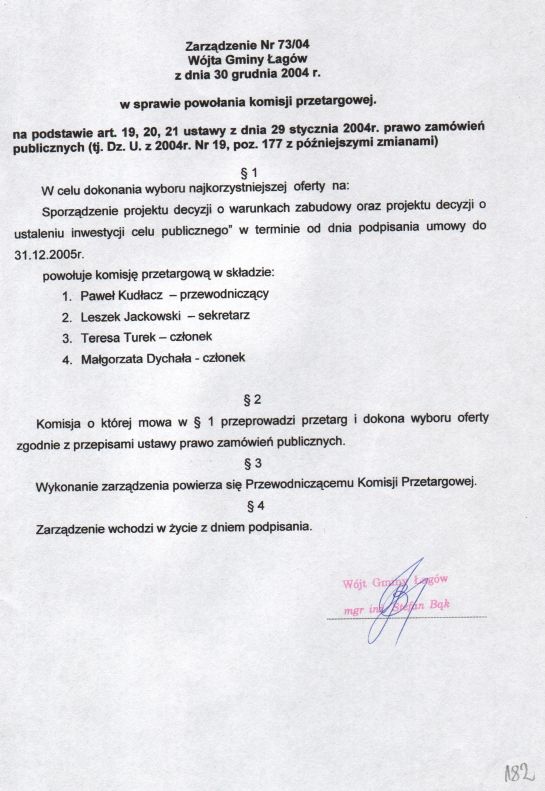 | Zarządzenie nr 73/04 Wójta Gminy Łagów z dn. 30 grudnia 2004 r. w sprawie powołania komisji przetargowej. | 2008-10-22 |