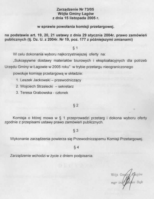| Zarządzenie nr 73/05 Wójta Gminy Łagów z dn. 15 listopada 2005 r. w sprawie powołania komisji przetargowej. | 2008-10-17 |