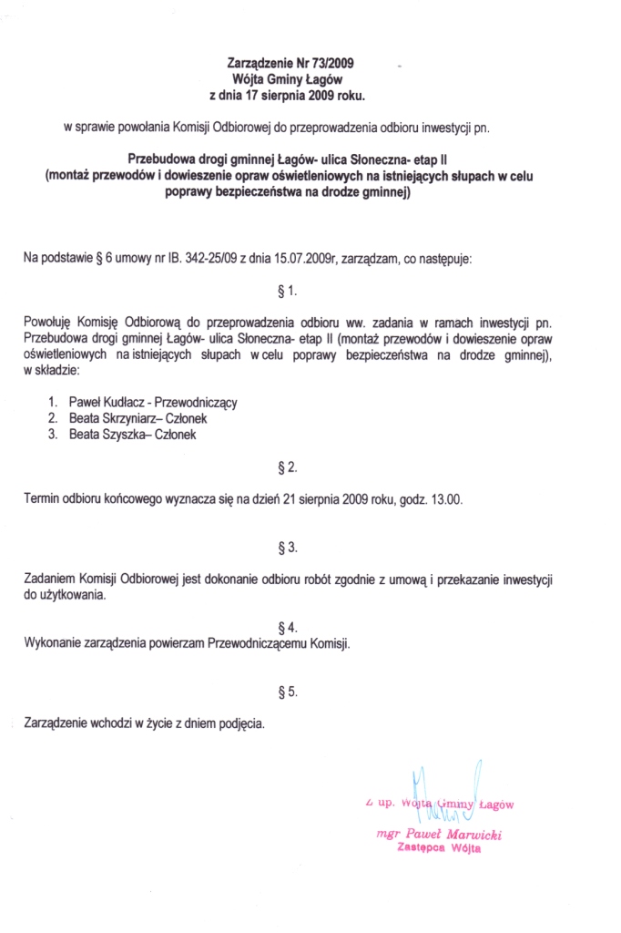 | Zarządzenie Nr 73/2009 Wójta Gminy Łagów z dnia 17 sierpnia 2009r. w sprawie powołania Komisji Odbiorowej do przeprowadzenia odb. inwestycji pn. "Przebudowa drogi gminnej Łagów - ul. Słoneczna - etap II". | 2009-09-16 |