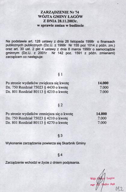 | Zarządzenie nr 74/03 Wójta Gminy Łagów z dn. 28 listopad 2003 r. w sprawie zmian w budżecie. | 2008-10-23 |