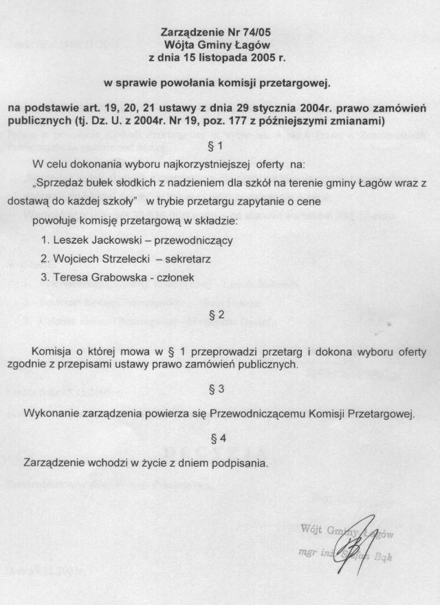 | Zarządzenie nr 74/05 Wójta Gminy Łagów z dn. 15 listopada 2005 r. w sprawie powołania komisji przetargowej. | 2008-10-17 |