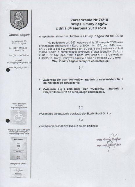 | Zarządzenie Nr 74/10 Wójta Gminy Łagów z dnia 04 sierpnia 2010 roku w sprawie : zmian w Budżecie Gminy Łagów na rok 2010 | 2010-09-13 |