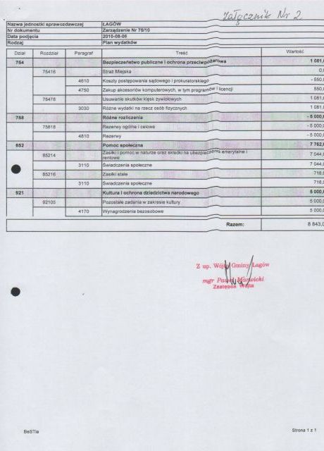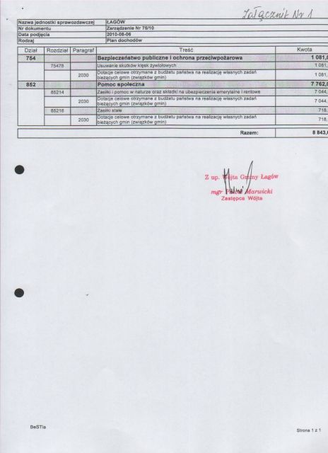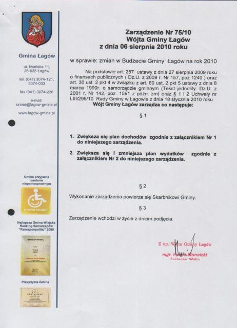 | Zarządzenie Nr 75/10 Wójta Gminy Łagów z dnia 06 sierpnia 2010 roku w sprawie: zmian w Budżecie Gminy Łagów na rok 2010 | 2010-09-13 |