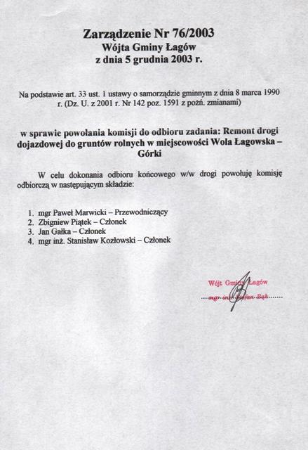| Zarządzenie nr 76/03 Wójta Gminy Łagów z dn. 5 grudnia 2003 r. w sprawie powołania komisji do odbioru zadania: Remont drogi dojazdowej do gruntów rolnych w miejscowości Wola Łagowska - Górki. | 2008-10-23 |