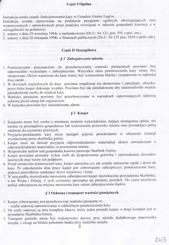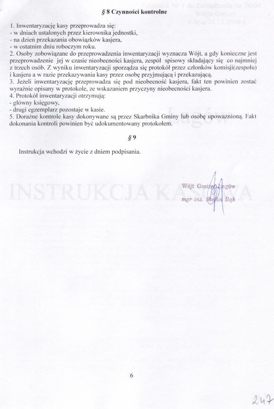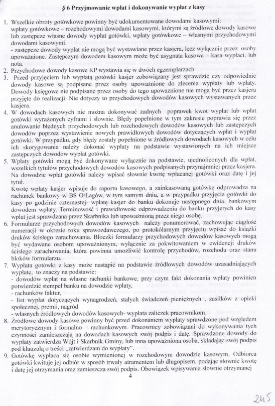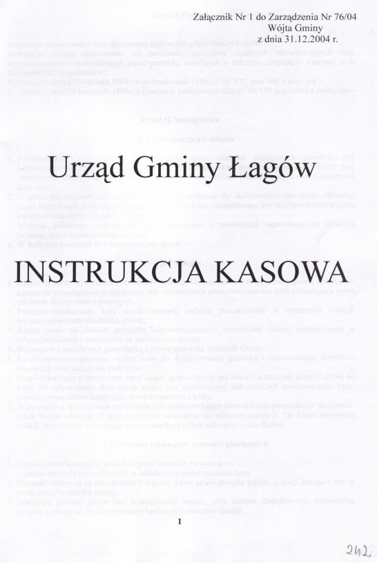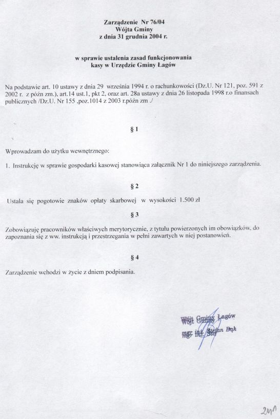 | Zarządzenie nr 76/04 Wójta Gminy Łagów z dn. 31 grudnia 2004 r. w sprawie ustalenia zasad funkcjonowania kasy w Urzędzie Gminy Łagów. | 2008-10-22 |
